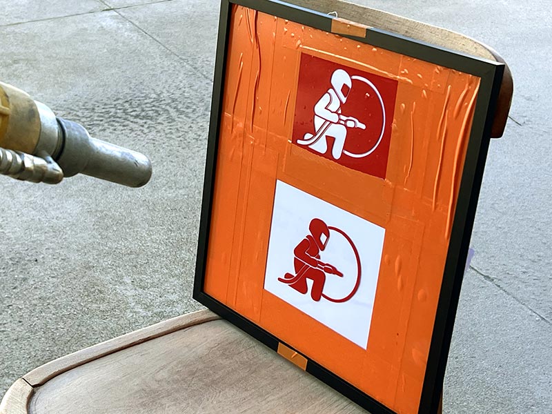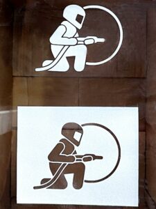 Décrivons tout d’abord le principe. Il s’agit de graver un motif par projection d’abrasif sur un support recouvert d’un pochoir préalablement réalisé en vinyle adhésif suffisamment épais pour résister à l’abrasion. Le pochoir sera découpé et évidé de manière à permettre le passage de l’abrasif à travers les zones n’étant plus protégées par l’adhésif.